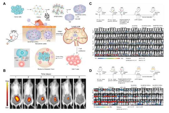 手術(shù)切除的腫瘤組織含有對患者特異性的新抗原,是成為制備個體化腫瘤疫苗最好的材料來源。作者利用細(xì)胞膜封裝的方式在二維光熱黑磷量子點(diǎn)(BPQDs)表面包裹腫瘤組織的細(xì)胞膜,從而制備具有光熱效應(yīng)的納米腫瘤疫苗(BPQD-CCNVs),并且把納米腫瘤疫苗和集落刺激因子(GM-CSF)裝入熱敏水凝膠中。皮下注射水凝膠后可以在紅外光的作用下持續(xù)釋放納米疫苗以及集落刺激因子,招募并激活DC細(xì)胞,從而捕獲腫瘤抗原并激活腫瘤特異性T細(xì)胞。同時,尾靜脈注射PD-1抑制劑,阻斷PD-1/PD-L1免疫檢查點(diǎn)通路,增強(qiáng)T細(xì)胞抗腫瘤免疫應(yīng)答效應(yīng)。通過活體光學(xué)成像我們可以對腫瘤進(jìn)行生物發(fā)光標(biāo)記,從而長期連續(xù)監(jiān)測腫瘤在體內(nèi)的發(fā)展情況。實(shí)驗(yàn)結(jié)果表明通過光熱免疫治療可以有效清除實(shí)體腫瘤同時抑制術(shù)后轉(zhuǎn)移的復(fù)發(fā)。