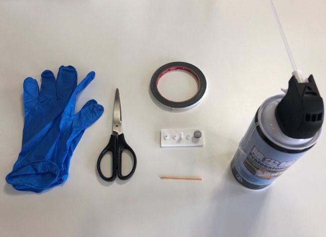 手套、剪刀、導(dǎo)電膠、樣品臺(tái)、樣品臺(tái)基座、牙簽、吹掃氣罐