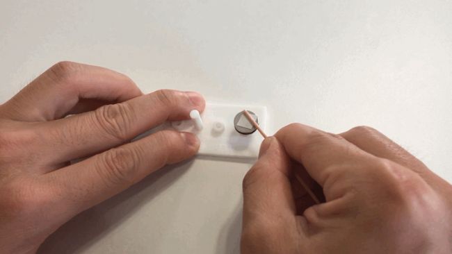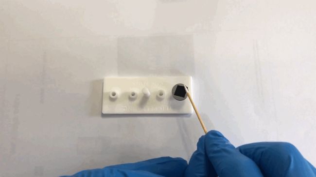 第二步 戴上手套,用牙簽挑取少量粉末,轉(zhuǎn)動(dòng)牙簽,把粉末倒在導(dǎo)電膠上