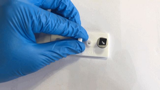 第一步 把樣品臺(tái)插在基座上,裁剪合適尺寸的導(dǎo)電膠,貼于樣品臺(tái),適當(dāng)碾壓,確保黏貼牢固