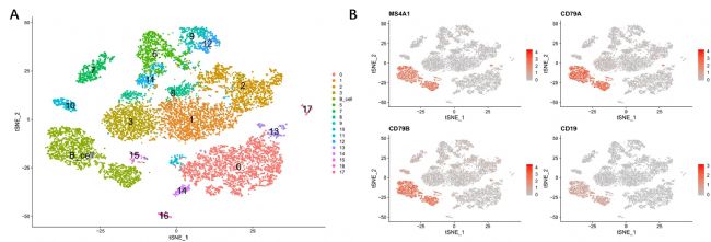圖1. A.t-SNE細(xì)胞分群圖及B細(xì)胞標(biāo)記;B. B 細(xì)胞4個(gè)Marker基因標(biāo)記分布圖