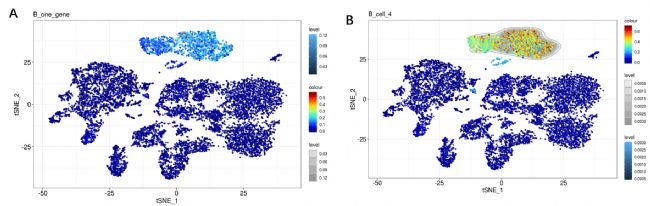 圖2. A.1個(gè)基因的B細(xì)胞標(biāo)記分布圖;B. 4個(gè)基因計(jì)算綜合Score值后的細(xì)胞標(biāo)記分布圖