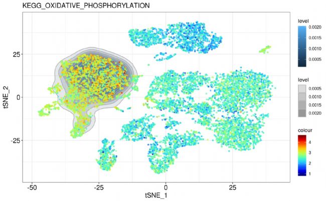 結(jié)果顯示,在該數(shù)據(jù)中,左邊顏色較深區(qū)域的細(xì)胞顯著富集氧化磷酸化細(xì)胞功能。因此,只要有感興趣功能的基因集,針對(duì)特定細(xì)胞集群的生物學(xué)功能挖掘,我們就能告訴您在哪些細(xì)胞中,該功能是顯著富集的。