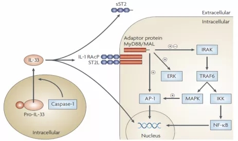 研究表明,IL33對肺和腸道的固有粘膜免疫,氣道炎癥和外周抗原特異性反應(yīng)具有重要意義。IL33通過刺激Th2型細胞以及各種免疫細胞包括嗜堿性粒細胞、肥大細胞、嗜酸性粒細胞和天然輔助細胞 (natural helper,NH) 等表達ST2并產(chǎn)生Th2細胞因子(如IL4、IL5、IL13和趨化因子等),在各種過敏性炎癥中發(fā)揮關(guān)鍵作用[2]。當(dāng)IL33、ST2和IL1RAcP組成受體復(fù)合物可以作為細胞因子的“警報素”,將信息轉(zhuǎn)移至胞內(nèi)(ST2L和IL1RAcP是IL33作用所必需的)。IL33/ST2信號通路如下圖所示, ST2和IL1RAcP組成的受體復(fù)合物在細胞損傷或機械損傷期間釋放到細胞外,接收細胞外IL33信號導(dǎo)致Myd88、IRAK1/4和TRAF6募集,進一步促進轉(zhuǎn)錄因子NF-kB、JNK1/2和ERK1/2活化,引起炎癥反應(yīng)。