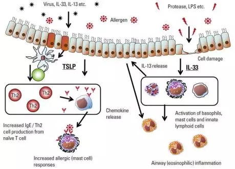 研究表明胸腺基質(zhì)淋巴細胞生成素 (TSLP) 主要對過敏原特異性IgE的產(chǎn)生/Th2分化有重要影響,與之不同的是IL33在哮喘發(fā)病機制對蛋白酶介導(dǎo)的與細胞損傷相關(guān)的先天性氣道炎癥至關(guān)重要[3]。