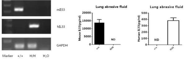 在純合子B-hIL33小鼠的脾細胞中可檢測到hIL33 mRNA,但未檢測到mIl-33 mRNA。通過ELISA分析野生型(WT)C57BL/6和純合子B-hIL33小鼠的肺研磨液,當(dāng)用LPS處理時,小鼠IL33可在野生型小鼠中檢測到,而人IL33可在純合子B-hIL33小鼠中檢測到。ND,未檢出。n=3。
