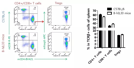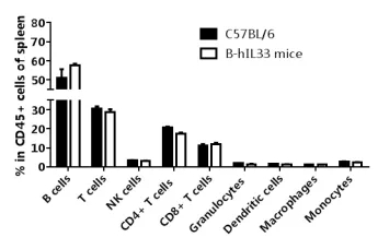 從C57BL/6和B-hIL33小鼠(n=3)的脾臟中分離淋巴細胞。流式細胞儀檢測其中T細胞亞群的比例。如上圖所示,純合子B-hIL33小鼠淋巴細胞亞群的比例與 C57BL/6小鼠相似,表明T細胞分化不受hIL33人源化的影響。