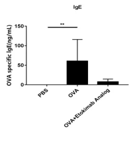 在研究終點時采集血清,進行IgE水平檢測。結(jié)果顯示,接受Etokimab Anolog治療的小鼠體內(nèi)IgE水平遠低于未接受治療的小鼠。