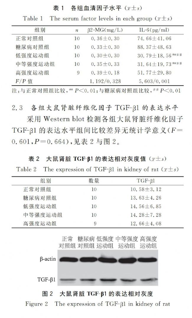 差異,可能是因?yàn)樘悄虿“l(fā)展緩慢,在糖尿病造模過程中腎臟損傷程度不足以引起血清β2MG水平發(fā)生變化。糖尿病的腎臟纖維化是糖尿病過程中最嚴(yán)重的微血管病變,也是腎衰竭的主要原因。TGF-β1則是糖尿病腎纖維化經(jīng)典信號(hào)通路的重要位點(diǎn),導(dǎo)致多種腎損傷出現(xiàn)進(jìn)行性腎衰竭,被公認(rèn)為是最主要的纖維化因子。Boor等對(duì)8周齡大鼠進(jìn)行中等強(qiáng)度運(yùn)動(dòng)干預(yù),發(fā)現(xiàn)運(yùn)動(dòng)組促纖維化細(xì)胞因子TGFB1mRNA表達(dá)量降低。毛彥穩(wěn)等研究發(fā)現(xiàn)SD大鼠糖尿病造模6周后,糖尿病組TGF-β1表達(dá)含量顯著高于正常對(duì)照組。蔣文娟等8研究發(fā)現(xiàn)糖尿病大鼠腎組織中TGFB1表達(dá)的增加程度與腎臟損害的嚴(yán)重程度致,而在本實(shí)驗(yàn)中發(fā)現(xiàn)各組間腎臟損傷因子B2MG變化趨勢(shì)和各組間腎臟TGFB1表達(dá)趨勢(shì)一致。但是各個(gè)運(yùn)動(dòng)組與糖尿病造模組和對(duì)照組間并無顯著性差異,其內(nèi)在機(jī)制并不清楚,可能與運(yùn)動(dòng)干預(yù)階段僅在T2DM動(dòng)物造模形成過程中有關(guān),相關(guān)影響因子對(duì)腎臟的影響時(shí)間及影響程度不足以引起腎臟TGF-B1表達(dá)發(fā)生改變總之,在T2DM大鼠造模過程中,施加8周的耐力運(yùn)動(dòng)干預(yù),腎小球基底膜出現(xiàn)一定的改善,對(duì)大鼠腎臟組織結(jié)構(gòu)具有一定保護(hù)作用,其作用機(jī)制可能是通過降低大鼠血清炎癥因子I1-6水平。同時(shí),腎臟損傷因子血清β2MG水平與腎臟纖維化表達(dá)因子TGFB1表達(dá)并未發(fā)生明顯變化,可能與相關(guān)影響因子對(duì)腎臟的影響時(shí)間及影響程度不足有關(guān),但具體作用機(jī)制還需進(jìn)一步研究。