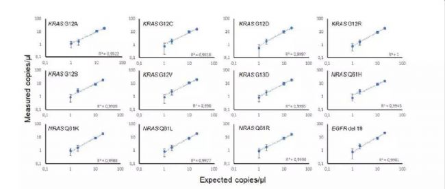 分別檢測7個(gè)和4個(gè)最常見的KRAS 12號外顯子和NRAS 3號外顯子突變,以及EGFR外顯子19缺失的Drop-off實(shí)驗(yàn)可靠性。在25ul PCR反應(yīng)體系中,以95%的置信度在連續(xù)稀釋范圍從5%到0.25%的突變DNA中可以檢測到最終濃度為1cp/ul的突變DNA。所有檢測均在104copis的野生型DNA 和400copies的內(nèi)部質(zhì)控(來源于ØX174噬菌體)中進(jìn)行,每個(gè)稀釋梯度進(jìn)行了3次重復(fù)。所顯示的置信區(qū)間是理論置信區(qū)間的均值,該置信區(qū)間是在95%置信區(qū)間上由取樣誤差和分區(qū)誤差組成。