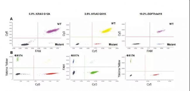 圖3信息說明如下:A:三重實(shí)驗(yàn)中KRAS,NRAS和EGFR drop-off實(shí)驗(yàn)2D圖。模板用的是商品化DNA(KRAS和NRAS)和來自冷凍腫瘤組織的DNA(EGFR)。WT:野生型。