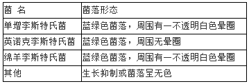 單增李斯特氏菌為該屬中唯一的致病菌,在該培養(yǎng)基上生長為藍綠色菌落,周圍還有一不透明白色暈圈;