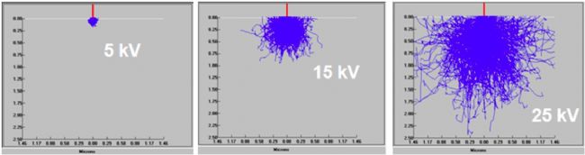 掃描電鏡在表征樣品時,受諸多參數的影響,不同類型樣品應選用合適的參數,才能呈現出樣品更真實的表面信息。如在不同的加速電壓下,電子束與樣品作用所獲得的信號會有很大的差別。從理論上說,入射電子在樣品中的散射軌跡可用 Monte Carlo 的方法模擬(如圖 1 所示),并且推導得到入射電子最大穿透深度 Zmax。