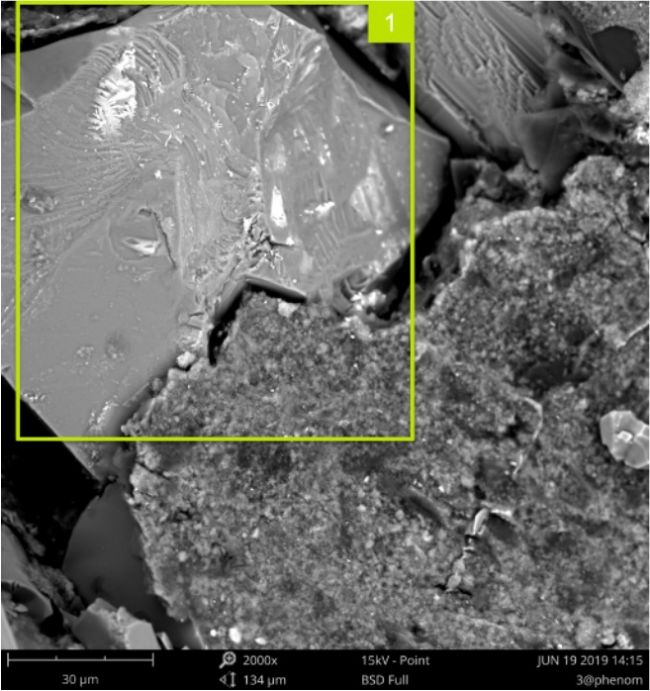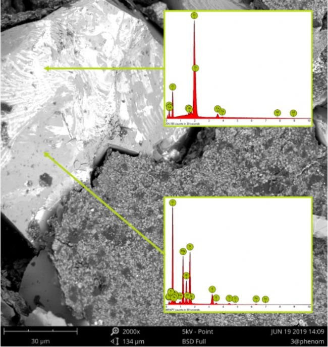由此看以看出,15kv 成像時,高能電子束穿透了表面含 Zr 層,呈現出了下部的主要由 O、Si、Mg、Al 組成相。在 5kv 成像時,電子束未穿透表面含 Zr 層,呈現出更接近于真實的樣品表面的成分襯度相。