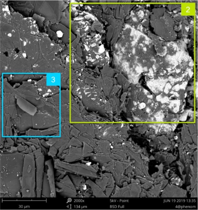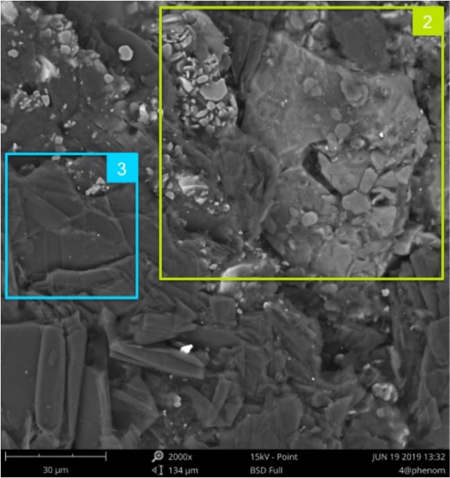 1、2 區(qū)域在 5kv 成像時,樣品表面有白色襯度相,在 15kv 成像時表面主要為灰色襯度相+少量白色襯度像。