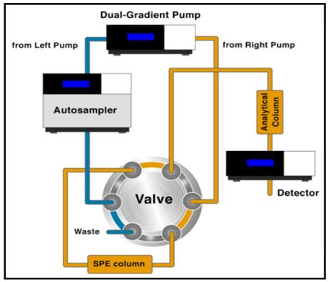 使用賽默飛雙三元液相系統(tǒng),樣品只需簡單超聲過濾即可大體積直接上樣富集、除雜、分析,整個過程全部實現(xiàn)自動化。下面是雙三元液相在線富集、除雜、分析的自動化工作流程: