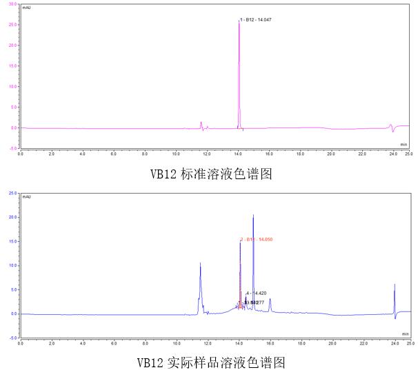 現(xiàn)行有效的國標方法主要有“添加離子對試劑的反相高效液相色譜分析方法”以及“使用氨基柱的色譜分析方法”[2] [3],可前者見VB12的色譜保留存在難點,離子對色譜法平衡時間較長;后者氨基柱法需特別注意柱子的使用范圍,對于習慣使用普通C18柱分析的用戶而言不太適應。