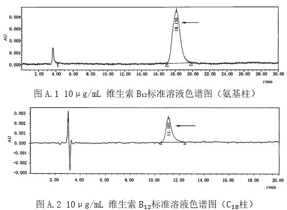 維生索B₁₂標準色譜圖(氨基柱)見圖A.1;維生素B₁₂標準色譜圖(C₁₈柱)見圖A.2。