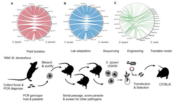 圖一C. tyzzeri的鑒定以及基因編輯 (上:隱孢子蟲種間基因組相似性比較,AB為常見感染人的兩種隱孢子蟲,C為常見感染鼠的隱孢子蟲)