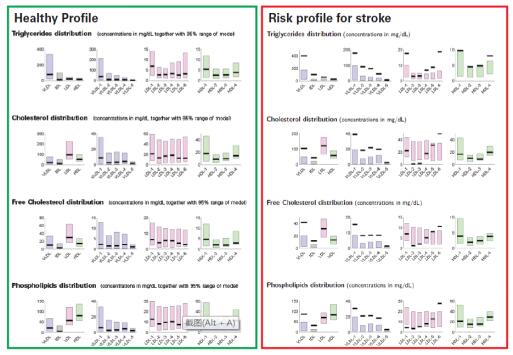 圖2顯示的是節(jié)選的、來(lái)自 2 個(gè)樣本的脂蛋白亞類分析,一個(gè)樣本來(lái)自健康受試者,一個(gè)樣本來(lái)自取樣 3 天后出現(xiàn)卒中的病人,兩張圖有明顯的區(qū)別,后者顯示出存在風(fēng)險(xiǎn)。