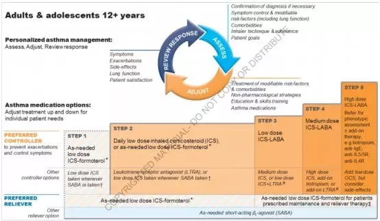 2019年全球哮喘防治倡議(GINA)發(fā)布的哮喘指南中,出于安全考慮不再推薦單獨(dú)使用SABA治療,而是建議所有成人和青少年哮喘患者,根據(jù)癥狀按需使用(輕度哮喘)或固定每日使用含有ICS的控制性治療。首次明確ICS-福莫特羅作為所有重癥哮喘的優(yōu)選緩解用藥和輕度哮喘的首選控制用藥,強(qiáng)調(diào)了全程抗炎維持緩解治療對于哮喘管理的基石地位。