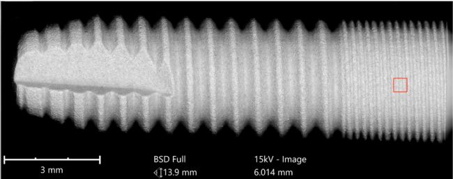 牙種植體是通過外科手術(shù)的方式將其植入人體缺牙部位的上下頜骨內(nèi),待其手術(shù)傷口愈合后,在其上部安裝修復(fù)假牙的裝置。掃描電鏡能夠觀察牙種植體表面形貌,并對微區(qū)成分進(jìn)行鑒定。