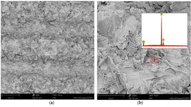 圖 2 (a) 圖 1 紅框區(qū)域微觀形貌,放大到 500 倍。(b) 對 a 圖中的白色框區(qū)域進(jìn)行放大觀察,并對嵌入顆粒進(jìn)行能譜分析