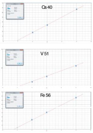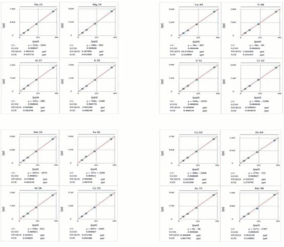 GDI-ICP-MS法繪制的校準曲線(標準氣體產(chǎn)生方式:在氬氣中霧化標準溶液,這些標氣對所有待測元素的線性都在0.9999以上)