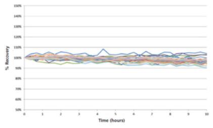 晶圓等半導(dǎo)體材料中的主要成分是硅。高硅基體的樣品在傳統(tǒng)的冷等離子體條件下分析,其中的耐高溫元素硅極易形成氧化物。這些氧化物沉積在錐口表面后,會造成明顯的信號漂移。NexION系列半導(dǎo)體專用ICP-MS在高硅基體的樣品分析中采用強勁的高溫等離子體,大大降低了信號漂移。通過通入純氨氣作為反應(yīng)氣,在DRC 模式下,有效消除了40Ar+ 對40Ca+、40Ar19F+ 對59Co+、40Ar16O+ 對56Fe+ 等的干擾。通過調(diào)節(jié)動態(tài)帶通調(diào)諧參數(shù)消除不希望生成的反應(yīng)副產(chǎn)物,克服了過去冷等離子體的局限,有效去除多原子離子的干擾。在實際檢測中實現(xiàn)了10 ng/L 等級的精確定量,同時表現(xiàn)出良好的長期穩(wěn)定性。