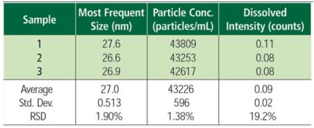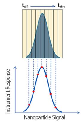 SP-ICP-MS技術(shù)具有高靈敏度、易操作、分析速度快的特點,納米粒子引入等離子體中被完全電離,隨后離子被質(zhì)譜儀檢測,信號強度與顆粒尺寸有關(guān)。因此SP-ICP-MS可為用戶提供顆粒濃度(顆/mL),尺寸大小和尺寸分布。為確保一次只檢測一個單顆粒,必須稀釋樣品以實現(xiàn)分辨的目的。這就要求質(zhì)譜儀必須能夠有很快的測量速度,以確保能夠檢測到在50nm納米顆粒的瞬時信號(該信號變化的平均時間為300~500μs)。珀金埃爾默NexION系列半導(dǎo)體專用ICP-MS單顆粒操作模式能夠采集連續(xù)數(shù)據(jù),無需設(shè)置定位時間,每秒鐘獲取高達100 000個數(shù)據(jù)點。結(jié)合納米顆粒分析軟件模塊,可以實現(xiàn)單顆粒納米顆粒的準確分析。