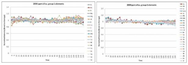 穩(wěn)定性:連續(xù)進樣分析多元素加標濃度為100ppt 的硅樣品溶液(硅濃度為2000ppm)
