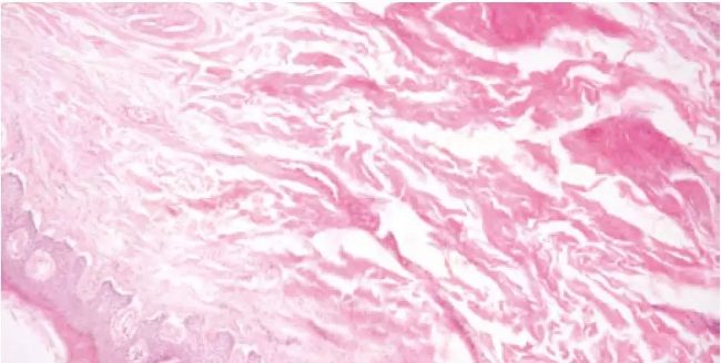 從大皮膚樣本中取出的切片,由于不充分的組織脫水導(dǎo)致大量膠原蛋白流失。這個(gè)案例很可能就是使用了嚴(yán)重污染的超過(guò)“臨界值”的試劑。