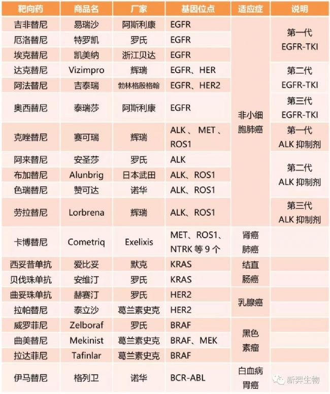 目前國內(nèi)已上市的腫瘤靶向治療藥物主要針對(duì)非小細(xì)胞肺癌、結(jié)直腸癌、乳腺癌等,比較常見的藥物如下表所列: