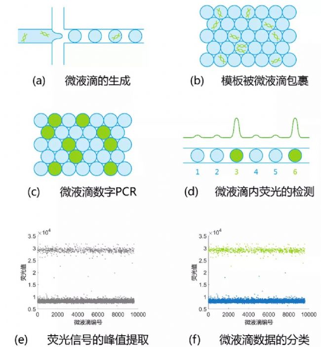 與qPCR技術(shù)不同,dPCR可在不借助任何外部或內(nèi)源參照的情況下直接對未知樣本靶標進行檢測并定量。如圖三所示,ddPCR技術(shù)的整體操作流程可簡單地歸述為:首先將含有核酸分子的反應體系分散成成千上萬個納升級的液滴;完成液滴PCR擴增反應過程;利用流式熒光檢測或熒光成像檢測技術(shù)將液滴判別為陽性(包含靶模板分子)、陰性(不包含靶模板分子)液滴,經(jīng)過熒光信號峰值提取、統(tǒng)計計數(shù)和泊松分布校正直接得到未知樣本中靶模板分子的濃度。通過上述流程,ddPCR技術(shù)實現(xiàn)對未知樣本中靶標的檢測和絕對定量。