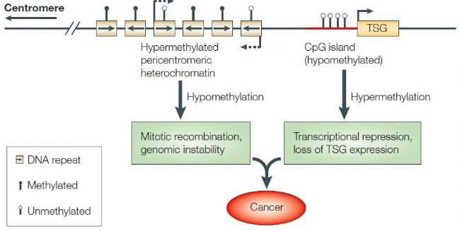 許多研究發(fā)現(xiàn),DNA甲基化在一系列的疾病(如癌癥等)起到十分重要的作用。在癌癥患者中,與正常人體相比,DNA甲基化多發(fā)生兩個(gè)變化:1、啟動(dòng)子區(qū)域CpG島的高甲基化,導(dǎo)致腫瘤抑制基因沉默;2:重復(fù)區(qū)域的低甲基化,導(dǎo)致基因組不穩(wěn)定1,2。