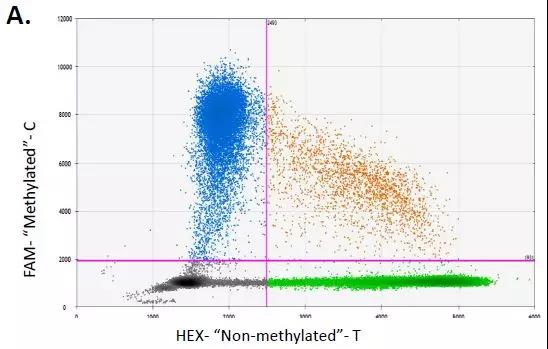 DNA甲基化的改變多發(fā)生于癌癥早期,在某些特定癌癥中,檢測(cè)特異的甲基化標(biāo)志物有助于癌癥的早期發(fā)現(xiàn),進(jìn)而大大提高癌癥患者的生存率。目前,美國(guó)國(guó)家癌癥協(xié)會(huì)(ACS)在最近更新的結(jié)直腸癌篩查指南中建議每3年做一次多靶點(diǎn)糞便DNA的甲基化檢測(cè)。因此,急需找到一個(gè)靈敏度高、特異性強(qiáng)、操作簡(jiǎn)單快捷的方法對(duì)臨床樣本DNA甲基化進(jìn)行檢測(cè)。微液滴數(shù)字PCR (ddPCR)是近年來PCR技術(shù)的一項(xiàng)新進(jìn)展,通過微液滴化,終點(diǎn)PCR和泊松分布,數(shù)字PCR無需標(biāo)準(zhǔn)曲線即可實(shí)現(xiàn)核酸濃度的絕對(duì)定量。與實(shí)時(shí)定量PCR技術(shù)(qPCR)對(duì)比,數(shù)字PCR具有靈敏度高,準(zhǔn)確度高、精密度高、重復(fù)性高,對(duì)PCR抑制劑耐受度高的優(yōu)勢(shì)。