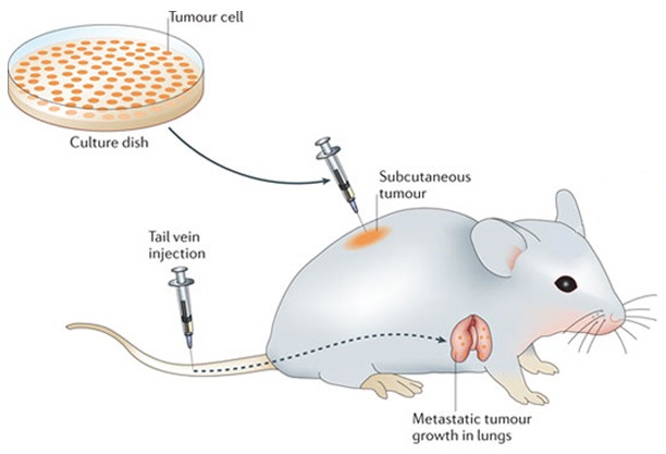 常見模型構(gòu)建方法是將腫瘤細(xì)胞懸液注射到免疫缺陷小鼠的原位/異位,觀察和評估腫瘤的生長或轉(zhuǎn)移情況。
