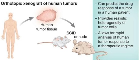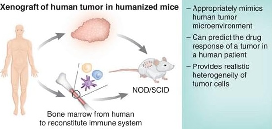 通過將患者腫瘤組織塊/細(xì)胞和外周血或骨髓細(xì)胞共同移植到免疫缺陷小鼠中,構(gòu)建了人源化異種移植模型。該模型重建了小鼠免疫系統(tǒng),用于研究腫瘤環(huán)境和異種腫瘤基質(zhì)之間的相互作用對腫瘤的發(fā)展和轉(zhuǎn)移的影響。
