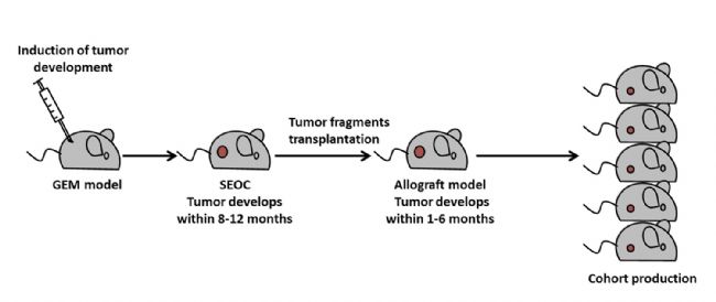 同種異體移植模型來自包括基因工程小鼠模型(GEMM)或致癌物誘導(dǎo)模型的自發(fā)小鼠腫瘤的同種異體移植。這種模型可以使小鼠原發(fā)性腫瘤很好的在組織病理學(xué)和遺傳圖譜上反映出來,在腫瘤表型分化、微環(huán)境豐富度和癌癥干細(xì)胞驅(qū)動等方面研究使用較多。
