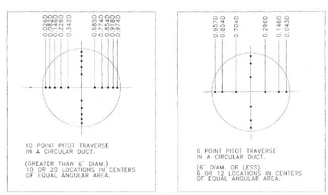 2)而NSF49-2018中,指出需要參考“Industrial Ventilation-Testing of Ventilation Systems”用皮托管的方法測量。按照管道直徑,對大于6英寸的管道,2個軸,每個軸10或20個點(diǎn);對小于6英寸的管道,2個軸,每個軸6個點(diǎn)或者12個點(diǎn)。把皮托管按照測量點(diǎn)放入管道,通過得到的動壓值得到通過管道橫截面的風(fēng)速,在通過測量供氣流量計算得出進(jìn)氣風(fēng)速。
