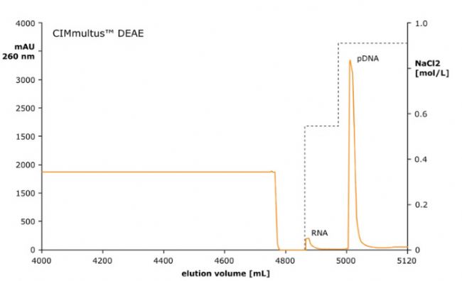 圖 1:AEX CIMmultus™DEAE(2μm)柱上的質(zhì)粒 DNA 洗脫曲線