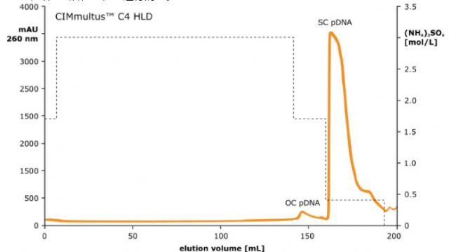 在高配體密度丁基修飾的(CIMmultus TM C4 HLD)整體柱上,利用疏水相互作用色譜柱(HIC)的拋光步驟,進(jìn)一步從 超螺旋(SC)治療級(jí) pDNA 中除去開(kāi)環(huán)(OC)和線性 pDNA 亞型。