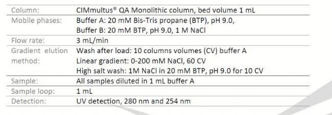 開發(fā)了一種快速,可重復(fù)的方法,用于在CIMmultus™ QA Monolithic column上通過線性梯度洗脫分離和定量空顆粒和全顆粒AAV8載體。 該方案成功地用于兩種不同的AAV制劑,并且能夠定量空衣殼含量,這與替代方法一致。 色譜方法的優(yōu)點是簡單,快速,不依賴于操作員技術(shù)和需要專門的試劑。 相反,它在單次測定中提供粒子特征的定量分析,運行時間為30分鐘。