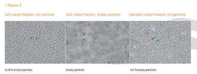 通過電子顯微鏡分析AAV8制劑制劑中完全和空顆粒的存在。 空殼用箭頭表示(圖1)。
