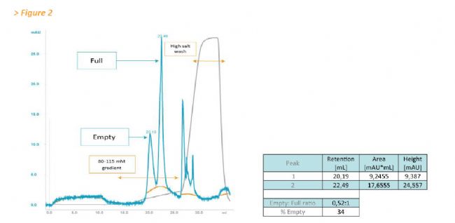 檢測到代表空衣殼和完整衣殼的明顯可區(qū)分的峰。 后來的洗脫峰含有> 99%的負(fù)載的全顆粒(通過qPCR測定)。 空衣殼的計算相對量(根據(jù)測量的峰面積)為34%(圖2)。