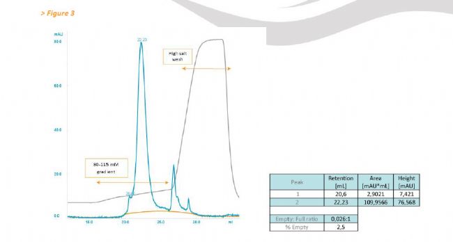 用完整和空AAV8載體顆粒的CsCl梯度制備物進行初始結(jié)合 - 洗脫實驗。 線性鹽梯度下的不同保留體積表明可以對全載體和空載體顆粒進行色譜分離(數(shù)據(jù)未顯示)。