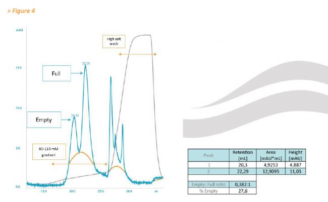 基于這些結(jié)果,將全粒子和空粒子的混合物應(yīng)用于CIMmultus™ QA Monolithic column整體柱(圖2)。 將任意體積的75μL空衣殼制劑與1×10 12 GC的含有93.7%完整AAV載體顆粒(通過EM測量)的制劑混合(圖2)。