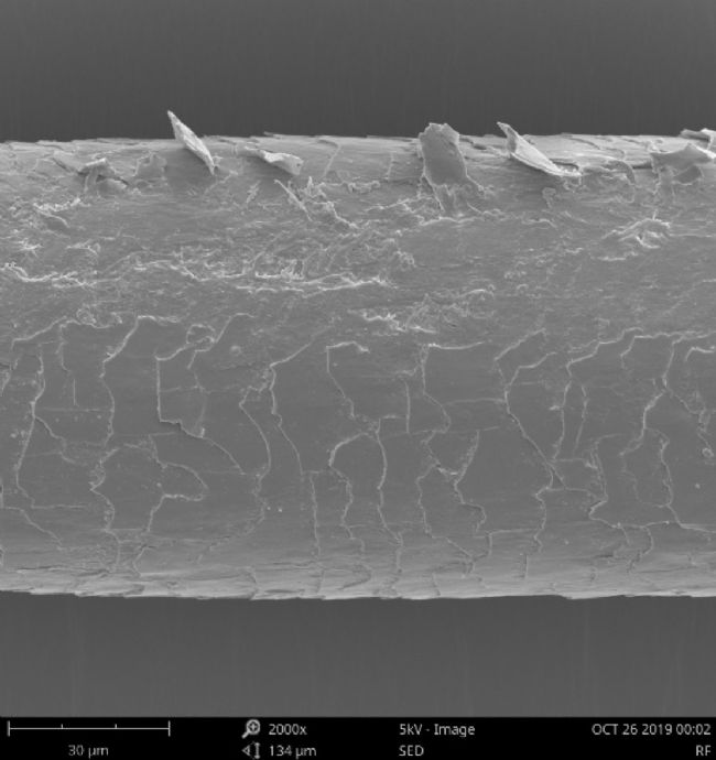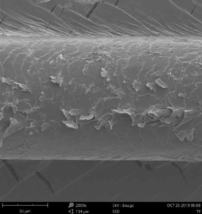下圖為經(jīng)過合成染發(fā)劑處理后的頭發(fā),毛鱗片同樣受到了破壞,并且皮質(zhì)層也受到了一定的侵蝕,可謂“滿目瘡痍”。