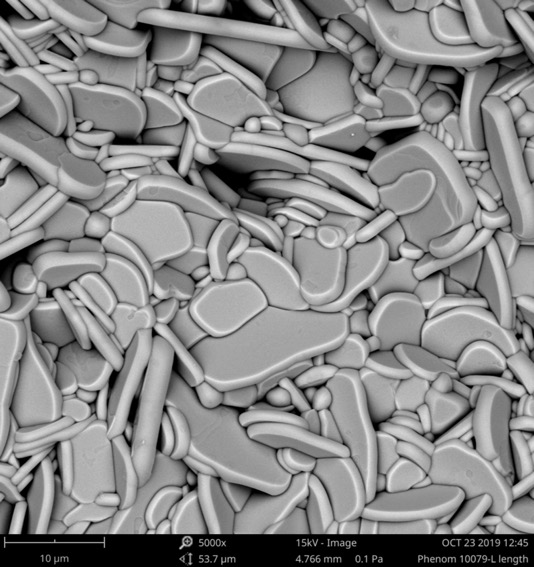 陶瓷在不同加速電壓(5kV、15kV)下的兩張照片: 加速電壓為 5kV 時(shí),可以看到燒結(jié)陶瓷的缺陷。