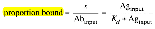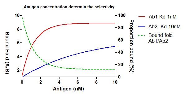 相同濃度的抗體,因?yàn)橛H和力不一樣,在同一抗原濃度下其proportion bound的比例也不一樣,用具體的圖形演示如下圖: